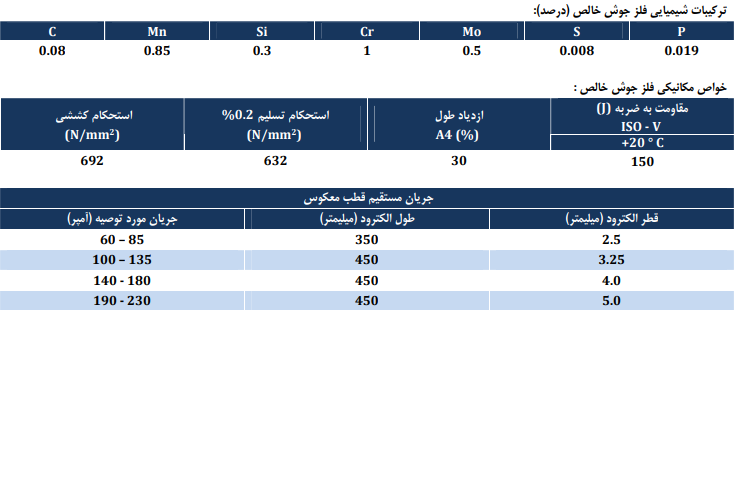 الکترود قلیایی کم هیدروژن که فلز جوش آن مقاوم به ترک بوده و برای جوشکاری فولادهای مقاوم به خزش و دیگسازی تا دمای کاری 570 درجه سانتیگراد مناسب است. این الکترود دارای قوس آرام و متمرکز بوده و برای جوشکاری در حالات اجباری مناسب است. جوش آن از نظر آزمایش رادیوگرافی از کیفیت مناسبی برخوردار است.